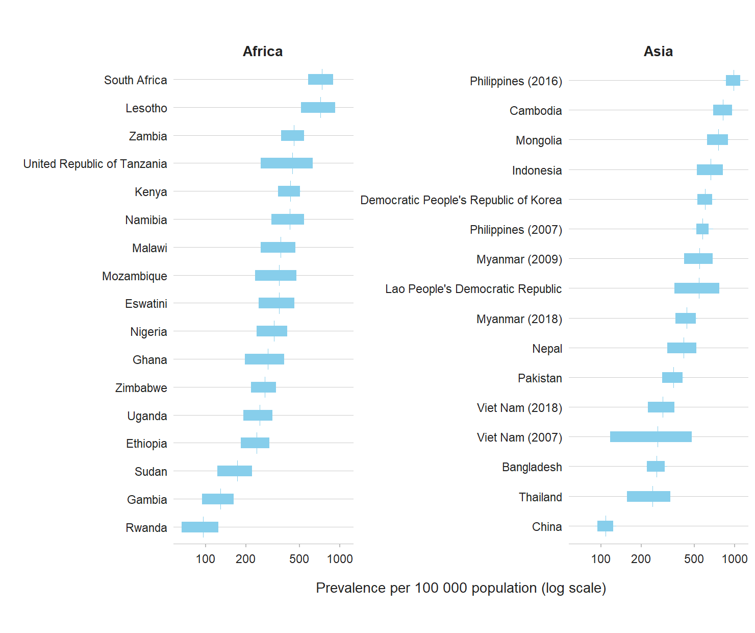 In African countries, prevalence ranged from 119 (95% confidence interval [CI]: 79–160) per 100 000 population in Rwanda (in 2012) to 852 (95% CI: 679–1026) per 100 000 population in South Africa (in 2017). In Asian countries,