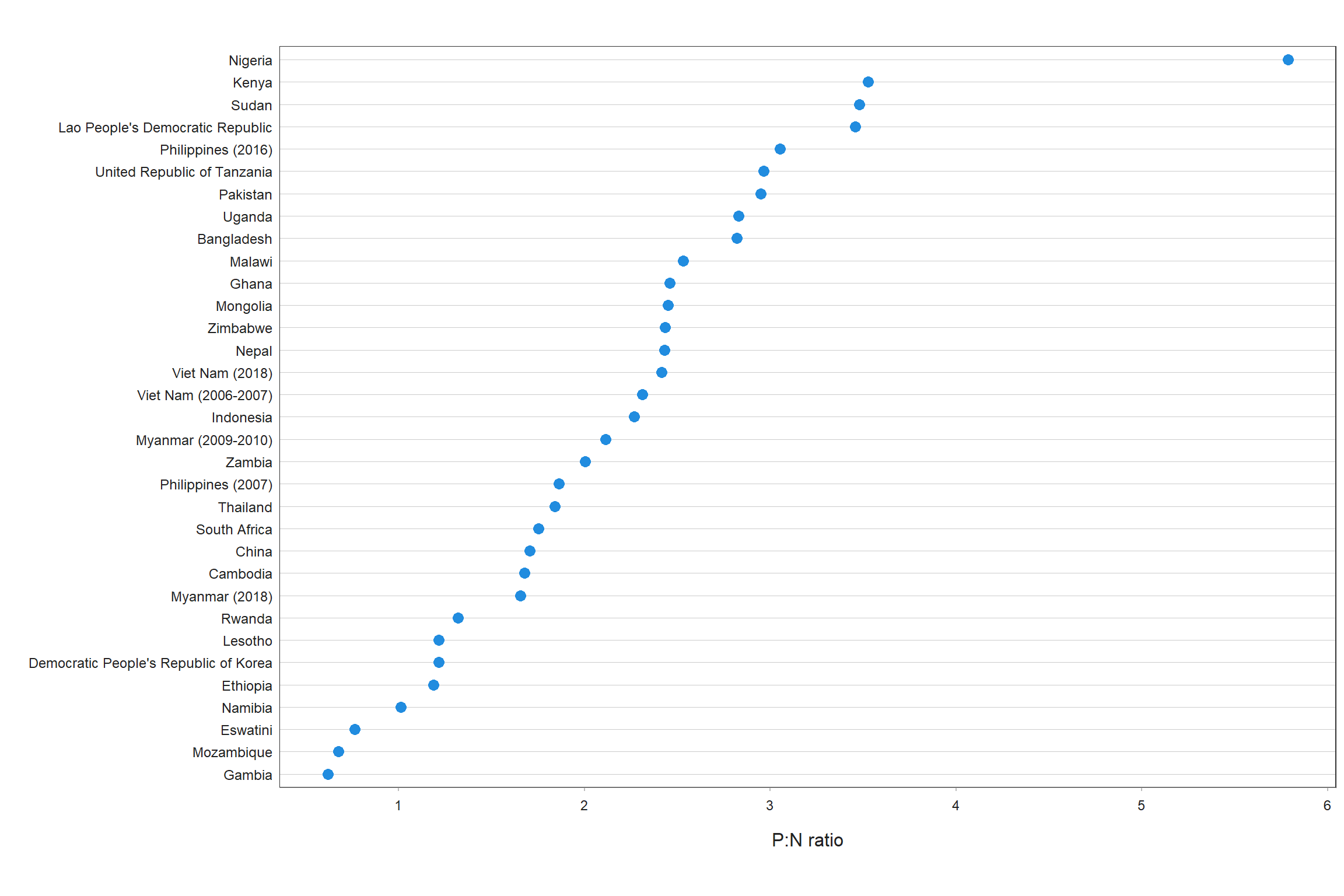 Fig. 2.3.7 The prevalence to notification (P:N) ratio of adult TB cases in prevalence surveys implemented 2007–2020