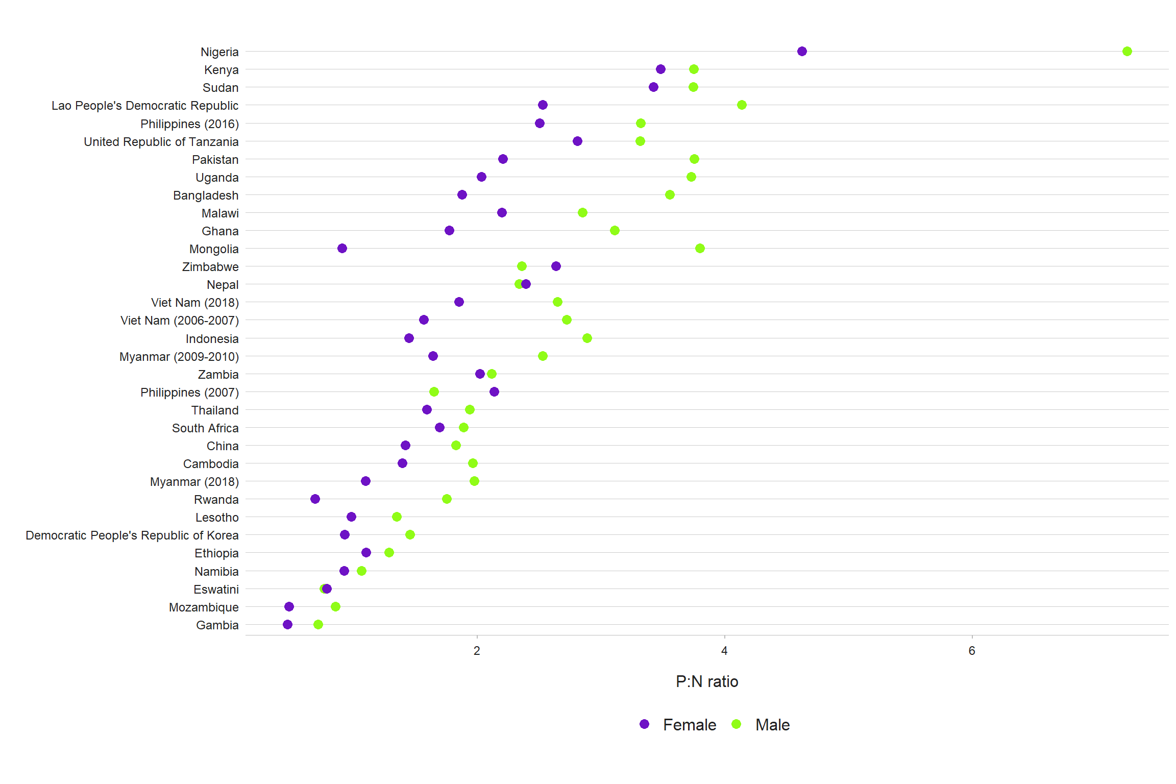 Fig. 2.3.8 The prevalence to notification (P:N) ratio by sex for adult TB cases in prevalence surveys implemented 2007–2020