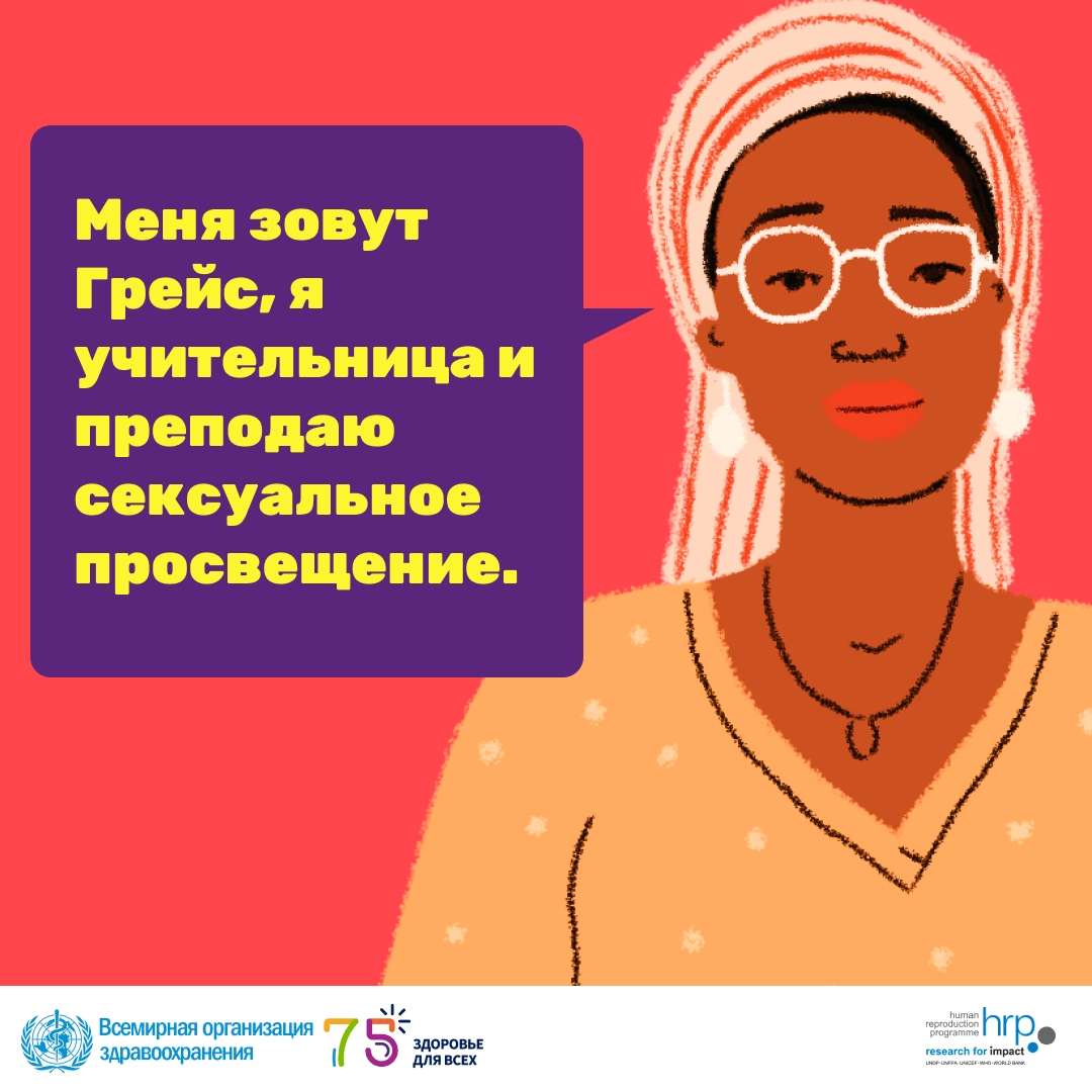 Меня зовут Грейс, я учительница и преподаю сексуальное просвещение. 26 марта 2024 г. | графика (анимированное изображение) Группа ВОЗ Департамент по вопросам охраны сексуального и репродуктивного здоровья и научным исследованиям