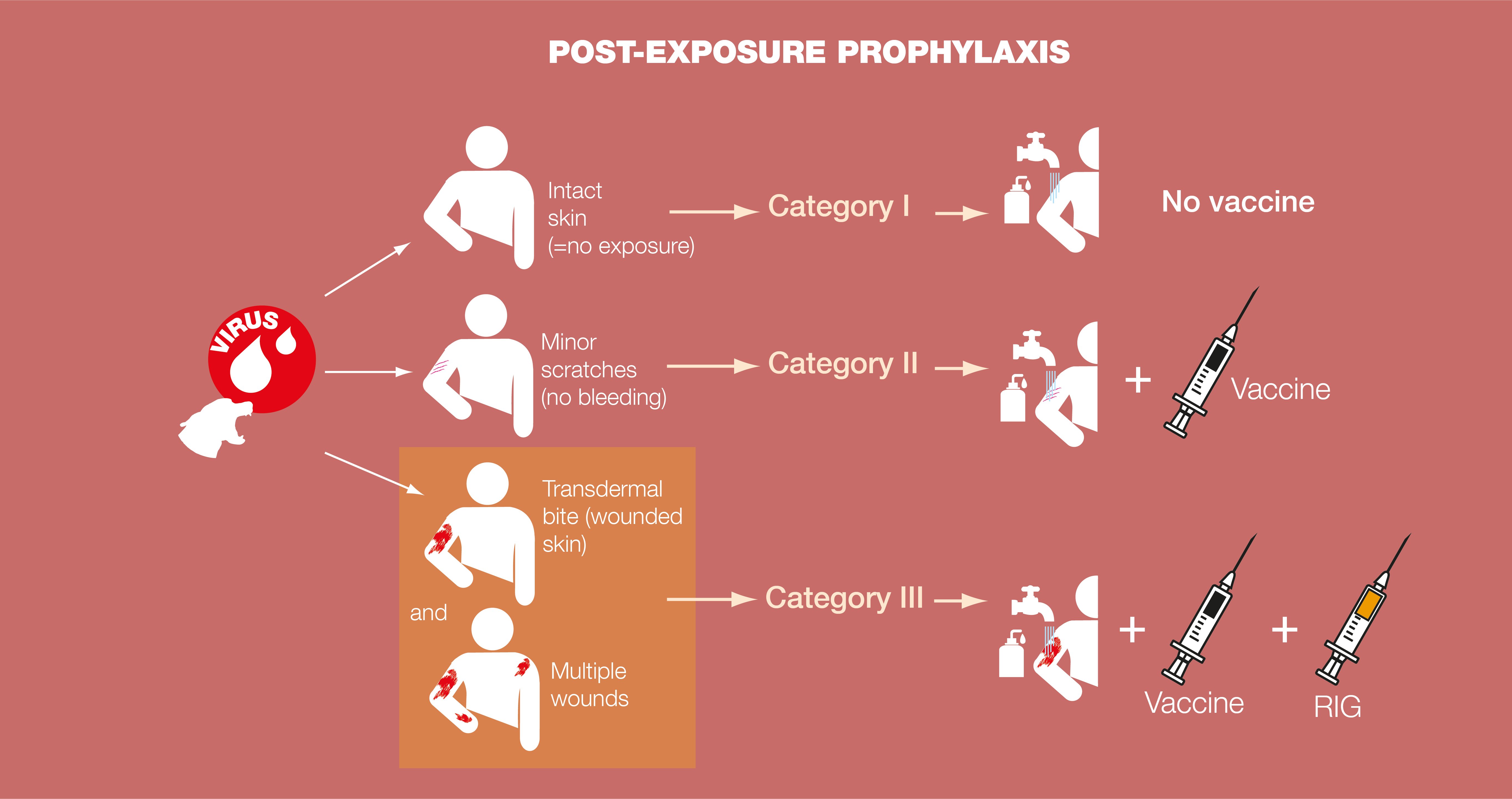 - For category I exposure (touching or feeding animals, licks on intact skin), no prophylaxis is required;