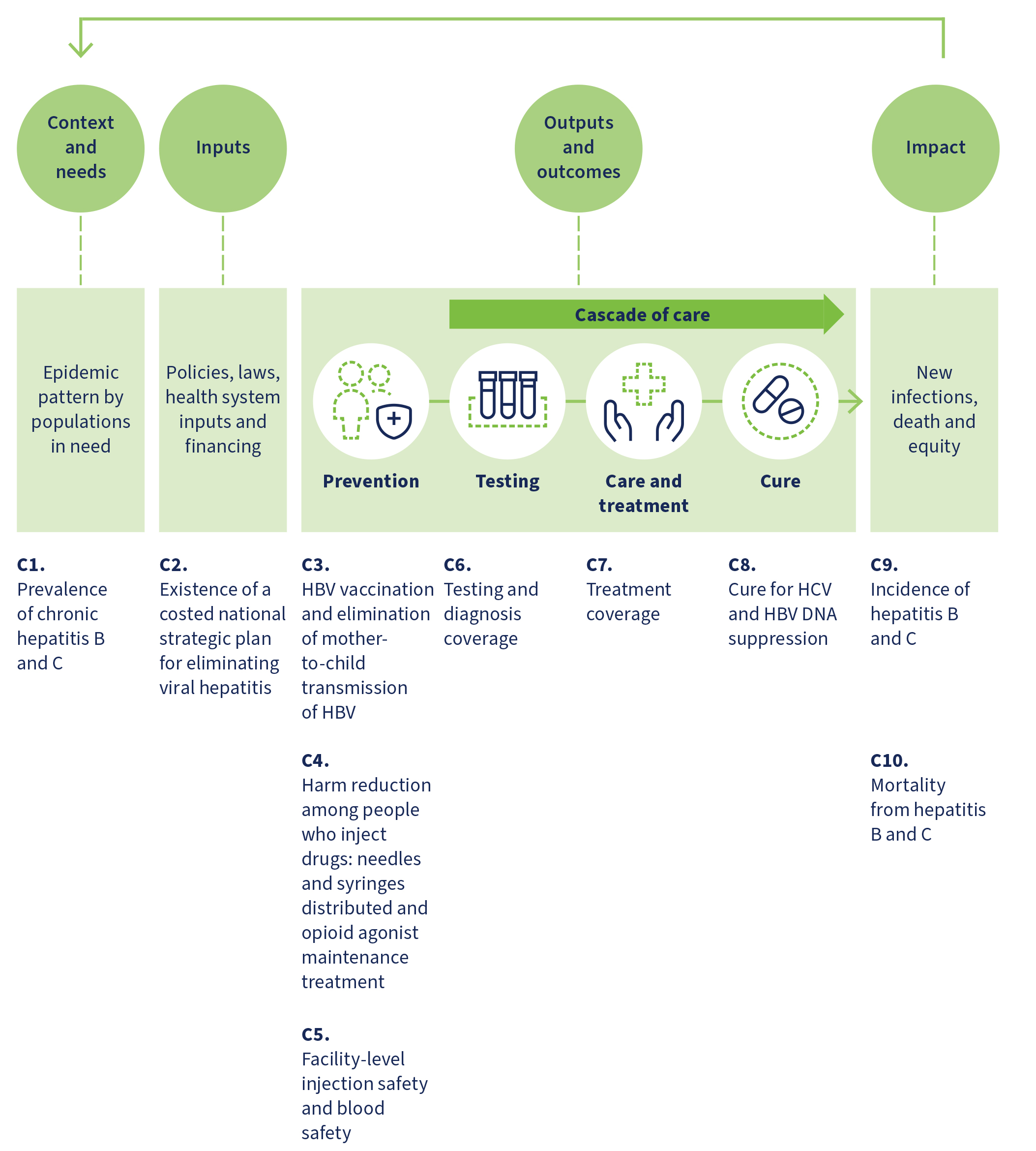The monitoring and evaluation framework for viral hepatitis tracks how hepatitis programmes are performing using a standard results-based approach that considers context (prevalence of infection), measures input, output and outcomes (including the cascade of prevention, testing and treatment), and impact (incidence and mortality). These components contribute to a comprehensive picture of the epidemiological situation of viral hepatitis. They provide strategic information to inform policy and programme decisions, and to monitor progress towards the elimination of viral hepatitis as a public health threat.