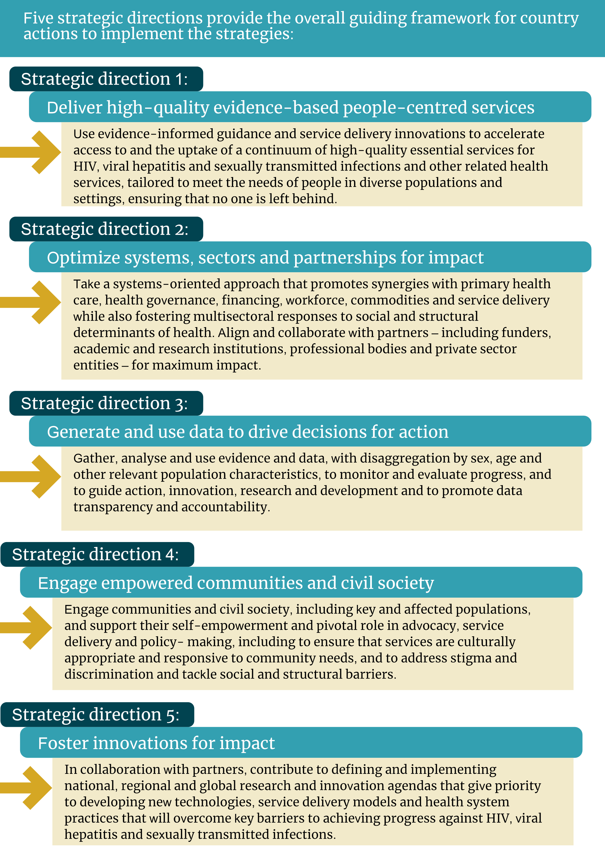 The new strategies propose a common vision to end epidemics and advance universal health coverage, primary health care and health security in a world where all people have access to high-quality, evidence-based and people-centred health services. The GHSS promote the disease-specific goals to end AIDS and the epidemics of viral hepatitis and sexually transmitted infections by 2030, with 5 strategic directions providing the overall guiding framework for achieving these goals.