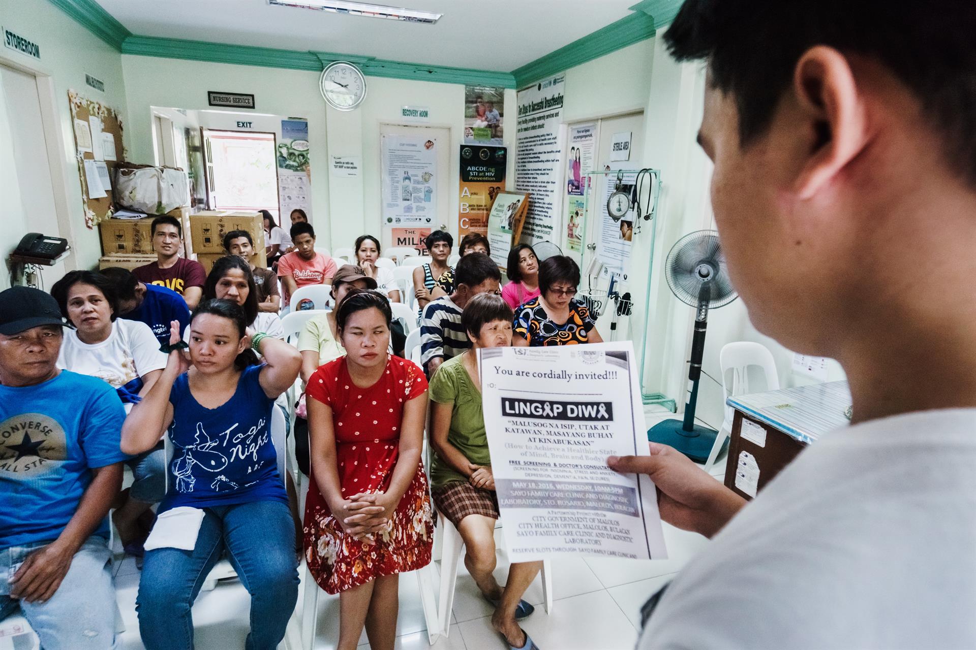 A health worker talks to the group of mentally disabled patients before the counselling session starts in Malolos, Bulacan