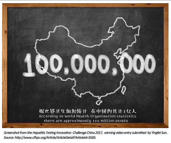 Crowdsourcing is the process of having a large group, including experts and non-experts, to solve a problem and then share the solution with the public[1]. Crowdsourcing is an innovative approach increasingly being used in public health. Challenge competitions for innovative product development are a useful means to engage affected communities and the wider public to address social stigma associated with hepatitis infection and encourage testing, while also producing promotional materials for distribution that are of high quality and cost-effective. One example of the use of crowdsourcing was an innovation challenge held in China. In 2017, 13 governmental, nongovernmental, community and international organizations including the Chinese Center for Disease Control and Prevention (China CDC), WHO China and the University of North Carolina Social Entrepreneurship for Sexual Health (UNC-SESH) collaborated on a crowdsourcing challenge contest specifically addressing viral hepatitis. Participants could submit an image or video that encouraged hepatitis testing and addressed social stigma against people living with hepatitis. Contest finalists received recognition and prizes provided by partners during World Hepatitis Day celebrations in Beijing, where the materials were disseminated. A total of 168 images and videos promoting awareness of viral hepatitis were submitted by individuals and organizations as part of the contest. Of note was the fact that 15% of the submissions came from participants identified as chronically infected with HBV or HCV. This demonstrates that such challenges can be a unique opportunity to empower those living with hepatitis to advocate for themselves and offer their unique perspectives on the disease.