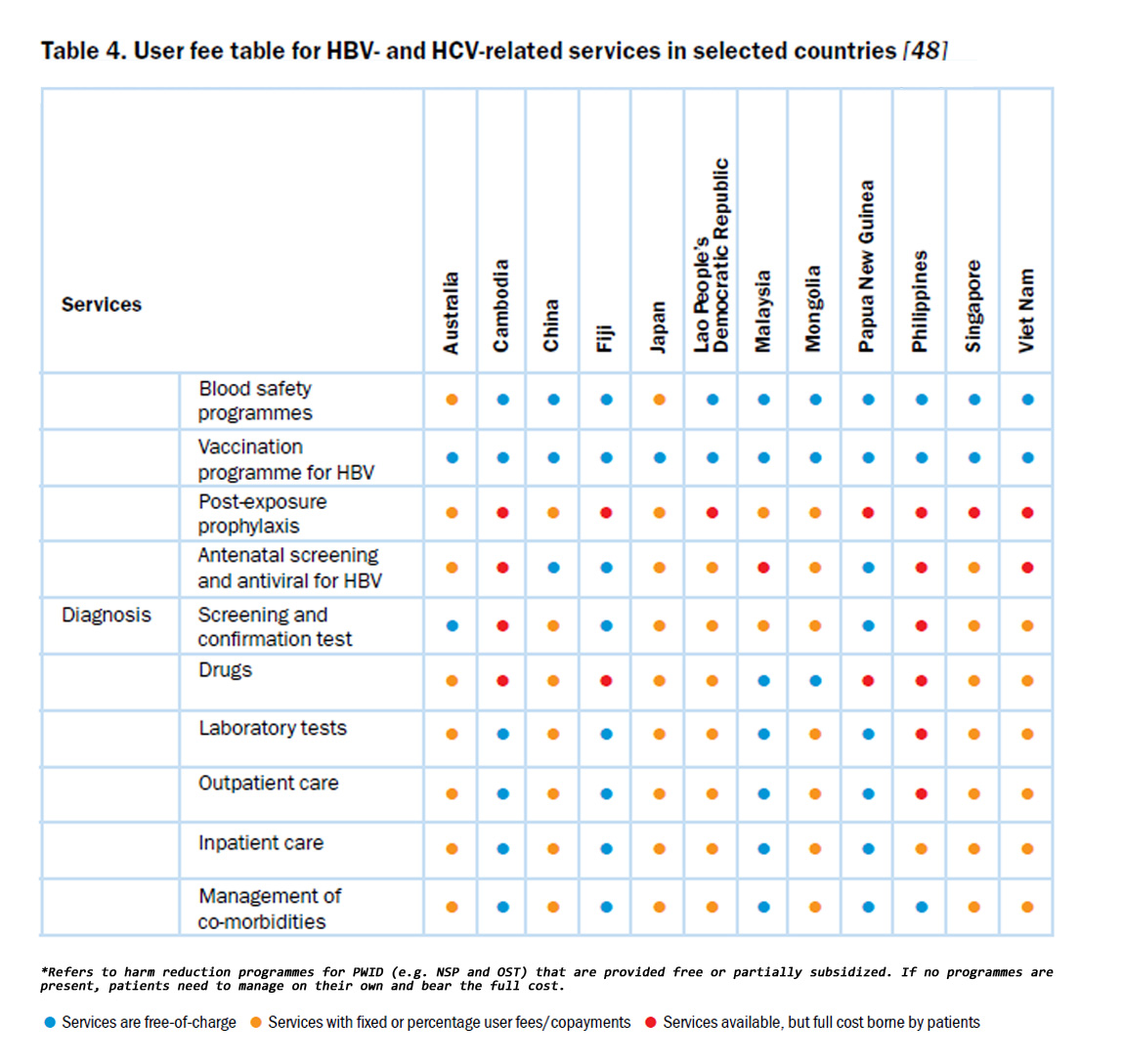 There are significant differences in how countries control the prices of medicines, ranging from free pricing to single-payer controlled pricing arrangements. Countries with single-payer systems achieved significant price controls for the new DAAs by using their monopoly purchasing power. For example, the Australian Department of Health negotiated a five-year volume-based price deal based on treating 62 000 people for AUS$ 1 billion. Already in the first year, over 38 000 people have been treated. This innovative approach removed price as a barrier to treatment[4]. In New Zealand, the Pharmaceutical Management Agency (PHARMAC) monopsony advantage helps to secure favourable prices for medicines in negotiations with suppliers. Options for using these purchasing strategies could be used in other countries where medicines are financed by the government. Greater sharing of information on prices and negotiation strategies across the Region is important to improve access to expensive medicines. Table 4 gives details of user fees for HBV- and HCV-related services in selected countries.
