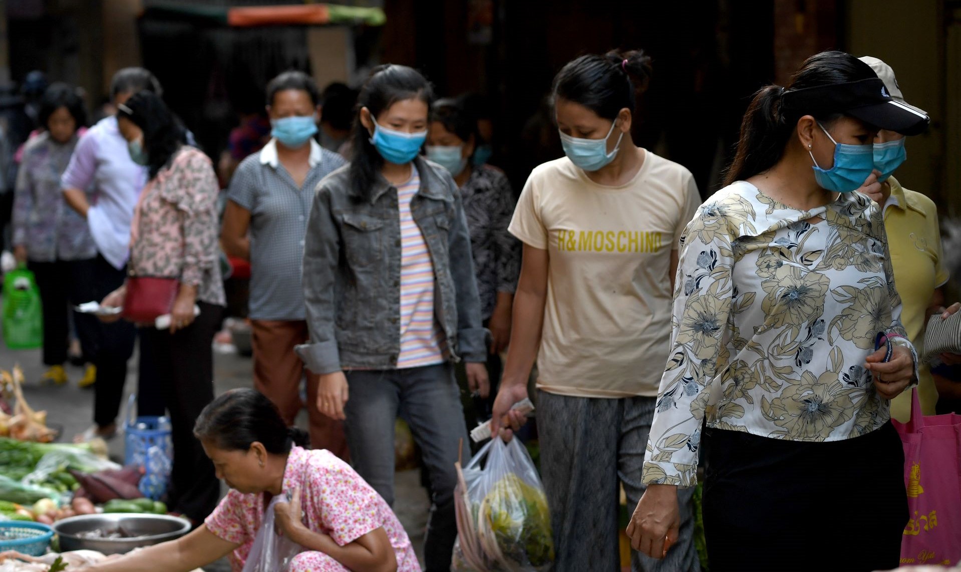 Cambodians taking protective COVID-19 measures at a market. © WHO Cambodia
